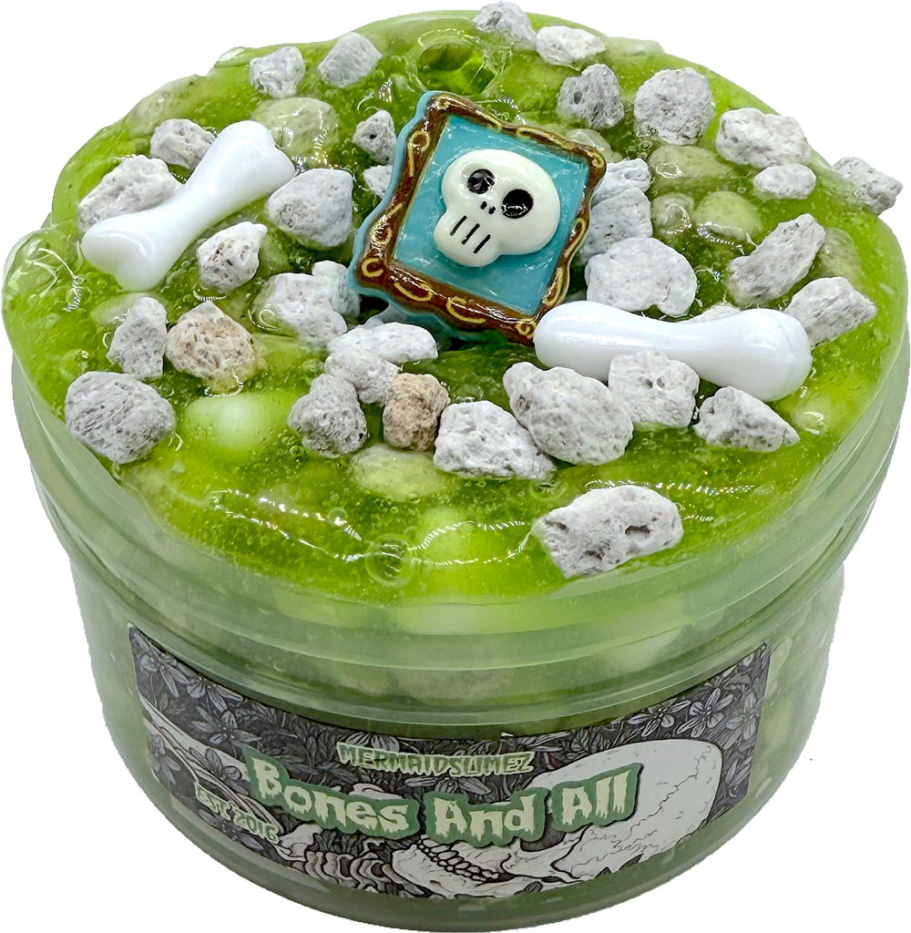 Introducing our newest texture! This is our first Pumice stone slime! It’s crispy crunchy and the rocks are softer on the hands than you’d think! The sounds that this texture produce are to die for! We’re absolutely in love with the overall design and concept for this slime from the texture and fragrance to the cute little skull portrait charm! On top of how cute this slime already is visually the bone charms are glow in the dark as well!