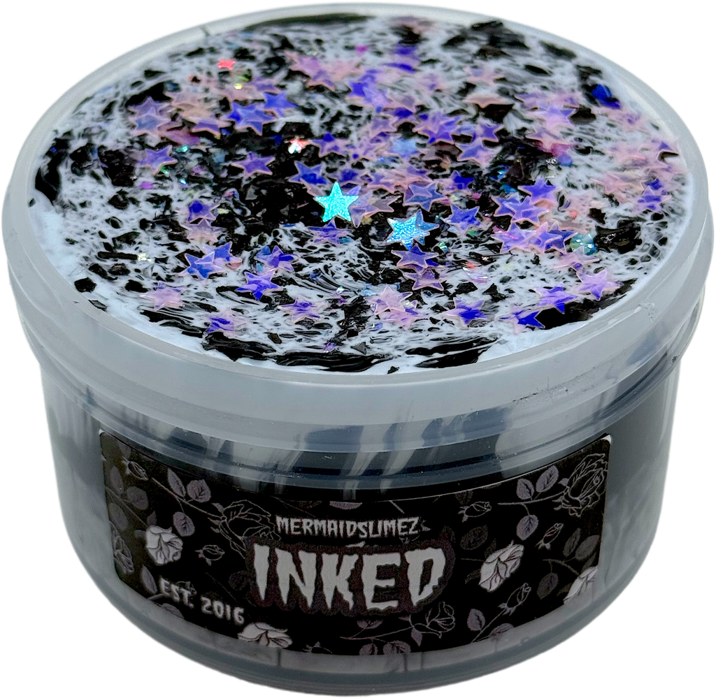 Inked is one of our newest products featuring a clear black base and a 1 oz thick and glossy to create this beautiful avalanche slime at home! Scented with a Cannabis flower fragrance oil and comes with a baggie of black iridescent glitter shards and pink stars!