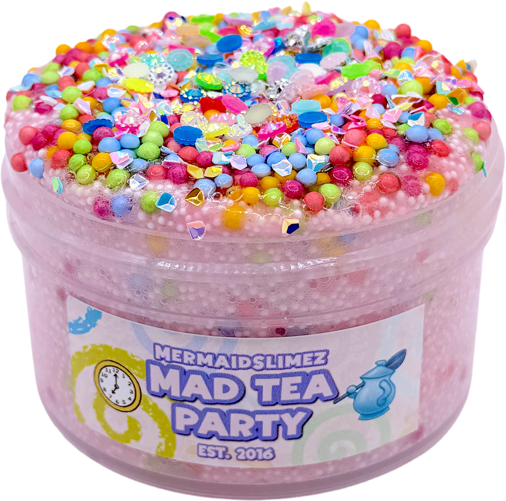 Mad Tea Party is a clear based micro floam scented with blend of orange and sweet birthday cake frosting! This combo is mouth watering and once inflated It makes crispy crunchy bubble pops! It’s filled with cute button like add ins, iridescent rainbow flakes, and rainbow floam beads!