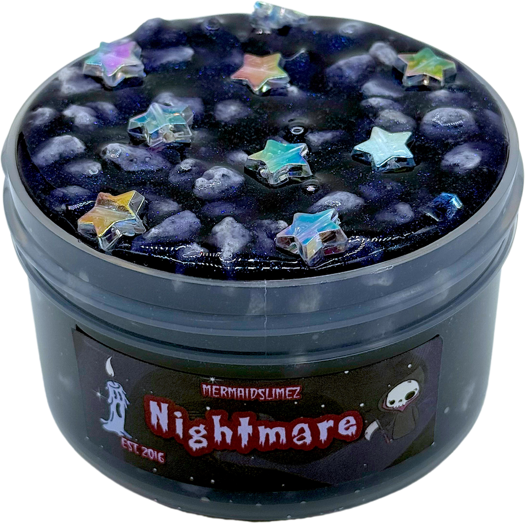 Nightmare is inspired by all the things that go bump in the night. The purple to blue color shift glitter is mesmerizing to play with! The Apple cider fragrance is sweet and spicy! The texture provides a good hurt type of crunch! We’re bringing back this one with an updated texture and pigment! We had to change the iridescent beads to pumice stone because of potential fall out with the other beads! The base is now a purple blue glitter color shifting slime with pumice stone and iridescent stars just like our first rendition of this product!